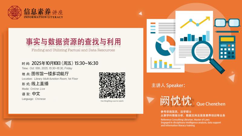 In our daily study, life and work, we often need to search for knowledge and information about facts and data. Fact resources can help us understand the information of specific institutions or individuals, as well as the meanings of certain terms and expressions; numerical resources can help us obtain reliable scientific data, economic statistics and operational data, etc. How can we find authoritative and reliable sources of fact and data resources? Libraries have purchased many fact and data resource databases, and there are also a large number of open access fact and data resources on the Internet. This lecture will introduce to you the ways to obtain various fact and data resources, common tools and usage methods.