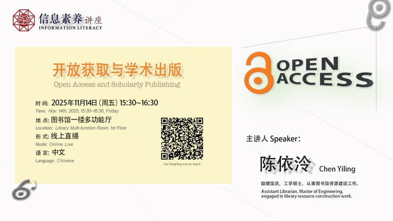 How can you make your research results visible to everyone? Make them open access! Open Access (OA for short) is a brand-new academic dissemination model. Its core feature is to provide free academic information and research results to users via the Internet under the premise of protecting the rights of authors. This lecture will help you further understand open access, learn about its development history and current publishing situation, explore various open access journal publishing models, and introduce the resources and service support provided by libraries for open access.