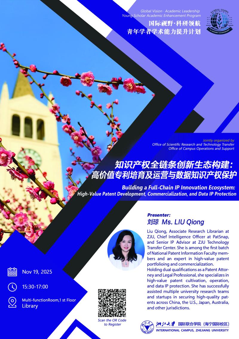 Speaker: LIU Qiong, Associate Research Librarian of Zhejiang University, Chief Intellectual Officer at Patsnap, and Senior IP Advisor at ZJU Technology Transfer Center. A nationally certified expert in patent information, she holds dual qualifications as a Patent Attorney and Legal Professional, with extensive expertise in high-value patent portfolioing and data IP protection.