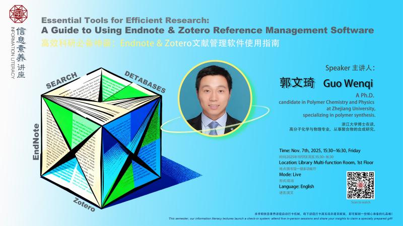 本期信息素养讲座,将立足学习者视角,系统讲解文献从检索、获取、管理到分析应用的全流程方法——涵盖多渠道文献查找技巧与高效整理分析策略。讲座将解析不同数据库的特点,助你快速定位所需文献,并介绍Endnote与Zotero等文献管理工具的使用,全面提升文献检索与利用效率。